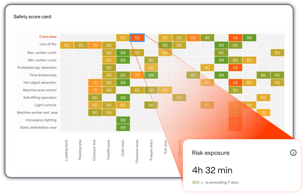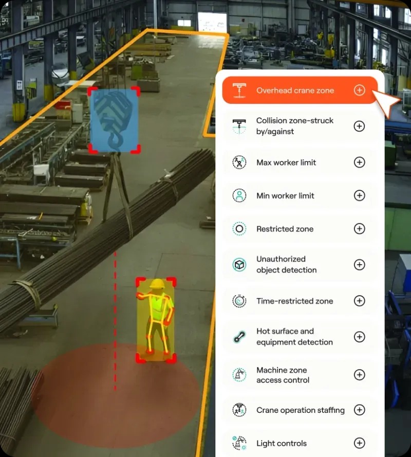 Pre-set AI-powered area safety scenarios, trained for real-world worksites to maintain safety in dynamic environments.