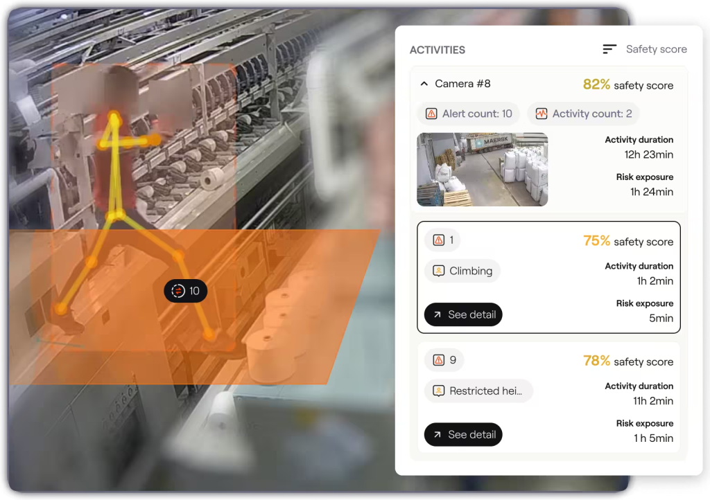 Prevent falls by detecting unsafe climbing on stacked materials, storage racks, or machinery platforms.